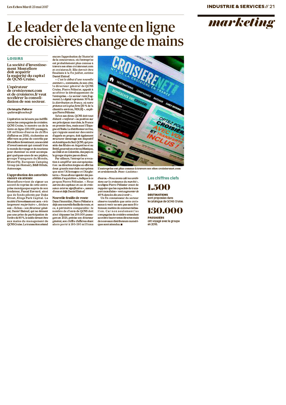 L’opération ne laissera pas indifférentes les compagnies de croisière. QCNS Cruise, le numéro un de la vente en ligne (130.000 passagers, 128 millions d’euros de chiffre d’affaires en 2016), s’achemine en effet vers sa prise de contrôle par