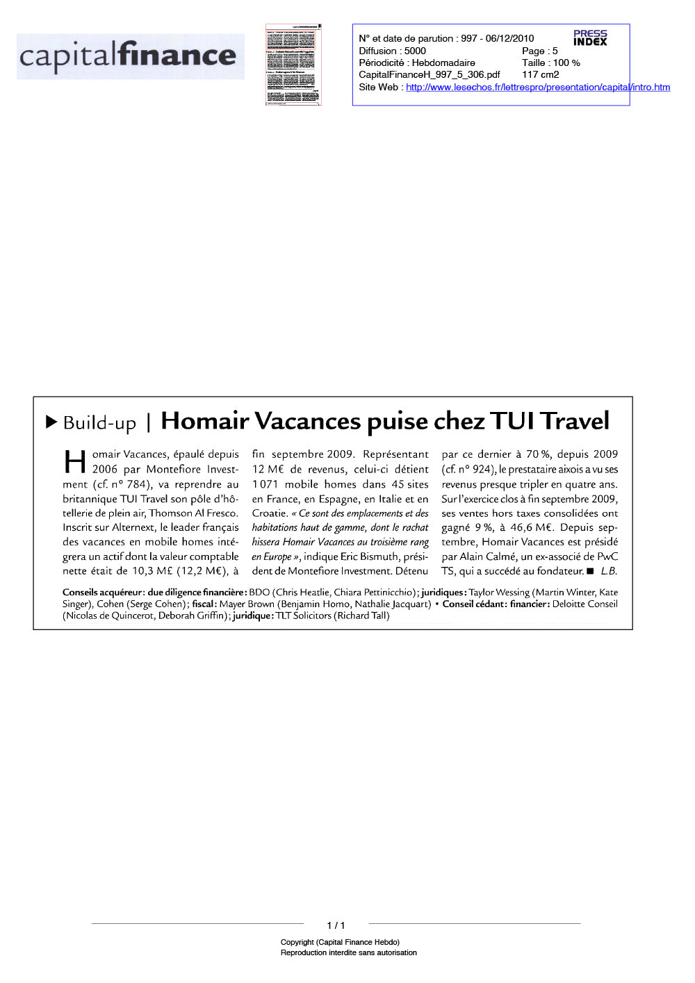 Homair Vacances, épaulé depuis 2006 par Montefiore Investment (cf .n?784), va reprendre au britannique TU ITravel son pôle d’hôtellerie de plein air, Thomson Al Fresco. Inscrit sur Alternext, le leader français des vacances en mobile homes intégrera un actif dont la valeur comptable nette était de 10,3 M£ ( 12 ,2 M-), à fin septembre 2009. Représentant 12M€ de revenu, celui-ci détient 1 071 mobile-homes dans 45 sites en France, en Espagne, en Italie et en Croatie. “Ce sont des emplacements et des habitations haut de gamme, dont le rachat hissera Homair Vacances au troisième rang enEurope“, indique Eric Bismuth, président de Montefiore Investment. Détenu par ce dernier à 70%, depuis 2009 (cf n°924), le prestataire aixois a vu ses revenus presque tripler en quatre ans. Sur l’exercice clos à fin septembre 2009, ses ventes hors taxes consolidée sont gagné 9%, à 46,6 M€. Depuis septembre, Homair Vacances est présidé par Alain Calmé, un ex associé de PwC TS, qui a succédé au fondateur.
