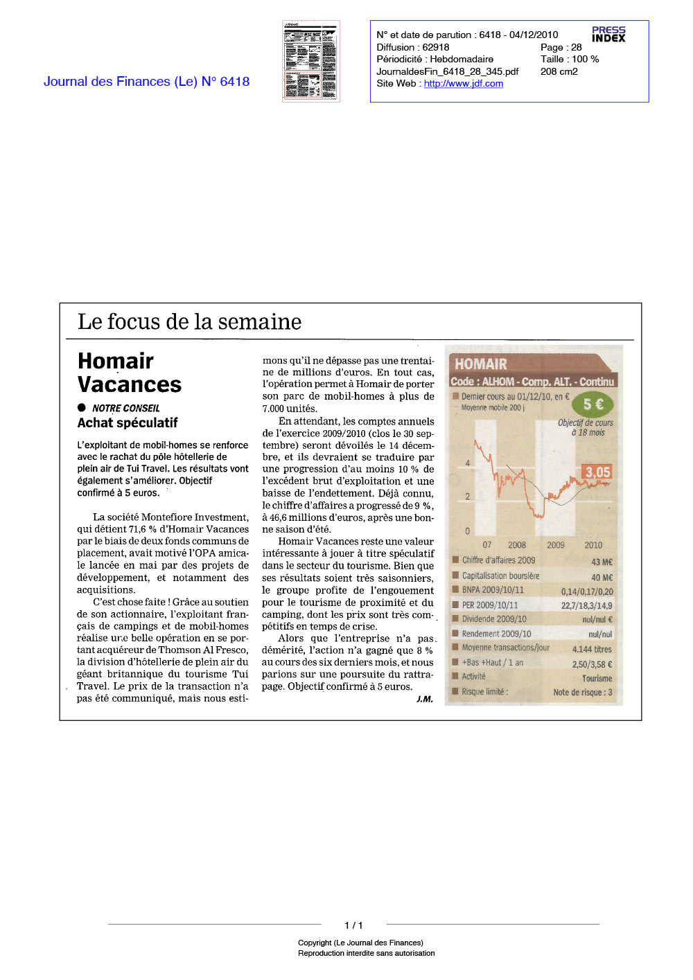 C’est chose faite! Grâce au soutien de son actionnaire, l’exploitant français de campings et de mobil-homes réalise une belle opération en se portant acquéreur de Thomson Al Fresco, la division d’hôtellerie de plein air du géant britannique du tourisme Tui Travel. Le prix de la transaction n’ a pas été communiqué, mais nous estimons qu’il ne dépasse pas une trentaine de millions d’euros. En tout cas, l’opération permet à Homair de porter son parc de mobil-homes à plus de 7.000 unités.