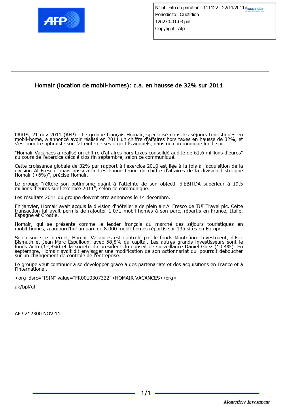 Le groupe français Homair, spécialisé dans les séjours touristiques en mobil-home, a annoncé avoir réalisé en 2011 un chiffre d’affaires hors taxes en hausse de 32%, et s’est montré optimiste sur l’atteinte de ses objectifs annuels, dans un communiqué lundi soir.