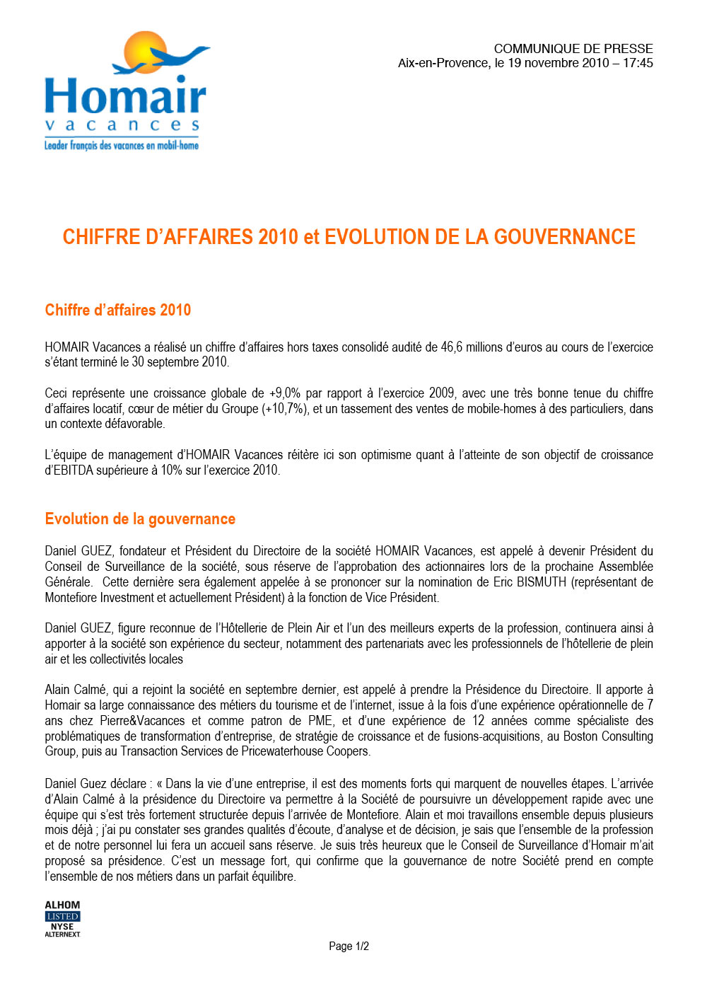 HOMAIR Vacances a réalisé un chiffre d’affaires hors taxes consolidé audité de 46,6 millions d’euros au cours de l’exercice s’étant terminé le 30 septembre 2010.