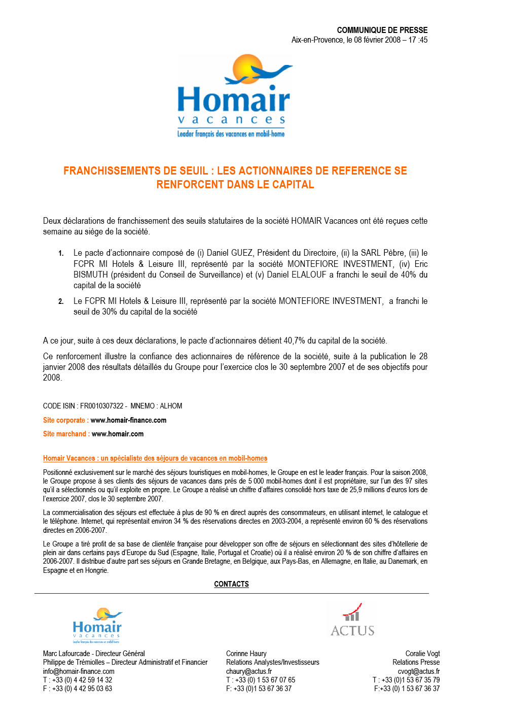 1. Le pacte d’actionnaire composé de Daniel GUEZ, Président du Directoire, la SARL Pèbre, le FCPR MI Hotels & Leisure III, représenté par la société MONTEFIORE INVESTMENT, Eric BISMUTH (président du Conseil de Surveillance) et Daniel ELALOUF a franchi le seuil de 40% du capital de la société.