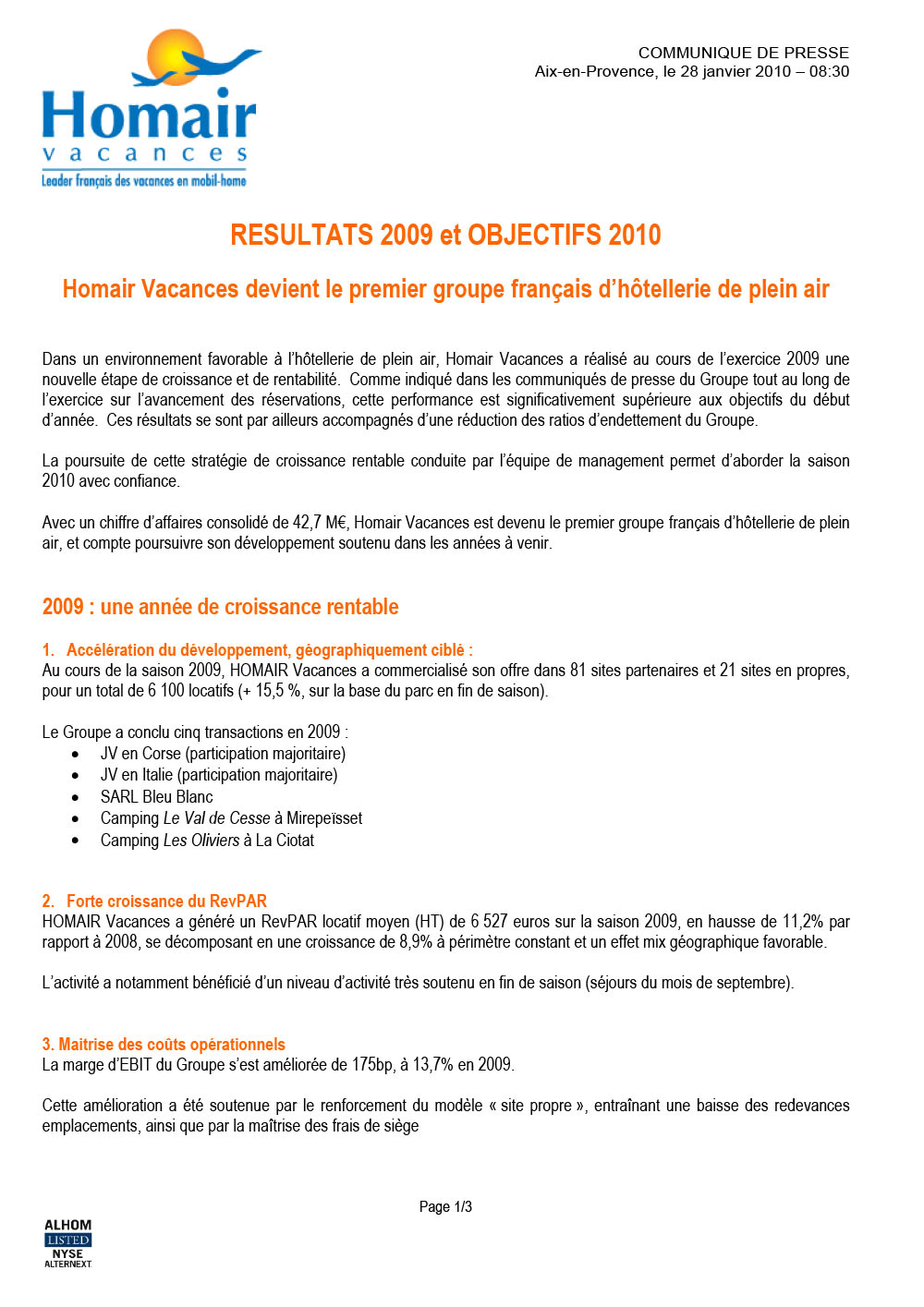 Dans un environnement favorable à l’hôtellerie de plein air, Homair Vacances a réalisé au cours de l’exercice 2009 une nouvelle étape de croissance et de rentabilité. Comme indiqué dans les communiqués de presse du Groupe tout au long de l’exercice sur l’avancement des réservations, cette performance est significativement supérieure aux objectifs du début d’année. Ces résultats se sont par ailleurs accompagnés d’une réduction des ratios d’endettement du Groupe.