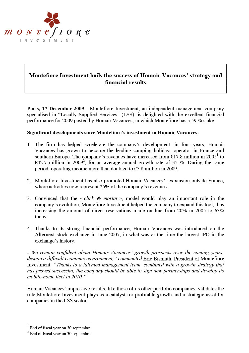 Montefiore Investment, an independent management company specialised in “Locally Supplied Services” (LSS), is delighted with the excellent financial performance for 2009 posted by Homair Vacances, in which Montefiore has a 59% stake.